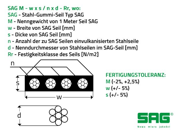SAG-Seile bestehen aus einer geraden Anzahl von runden Stahlseilen mit gewickelter Stahleinlage und linienförmigem Drahtkontakt in abwechselnd rechts und links gewickelten Litzen, die über die gesamte Länge mit einer Gummiummantelung einvulkanisiert sind.